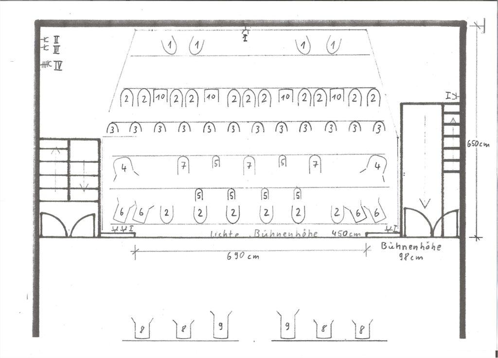 Unser Veranstaltungsort, die Alte Turnhalle in Leutershausen besticht durch ihre 60er-Jahre-Architektur mit roten Backsteinwänden, Parkettfußboden und abgehängter Decke. Die Bühne ist ca. 1 m erhöht, die Öffnung zum Zuschauerraum 6,90 m breit, und die Tiefe beträgt 6,45 m. Die Turnhalle ist komplett barrierefrei.