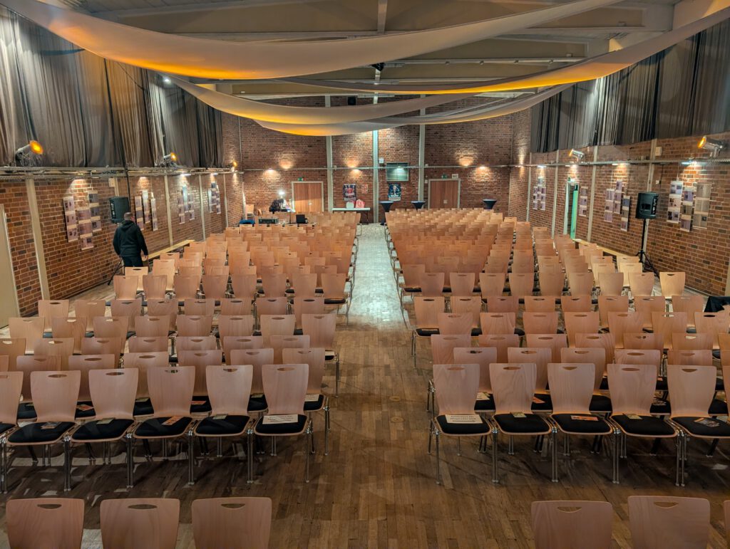 Die Halle bietet bestuhlt Platz für 391 Zuschauerinnen und Zuschauer. Bei kleineren Veranstaltungen stellen wir z.T. Bistro-, Lang- oder Stehtische. Jüngere Formate haben ohne Bestuhlung für Tanz und Schwof ebenfalls ihren Platz bei Aug und Ohr.